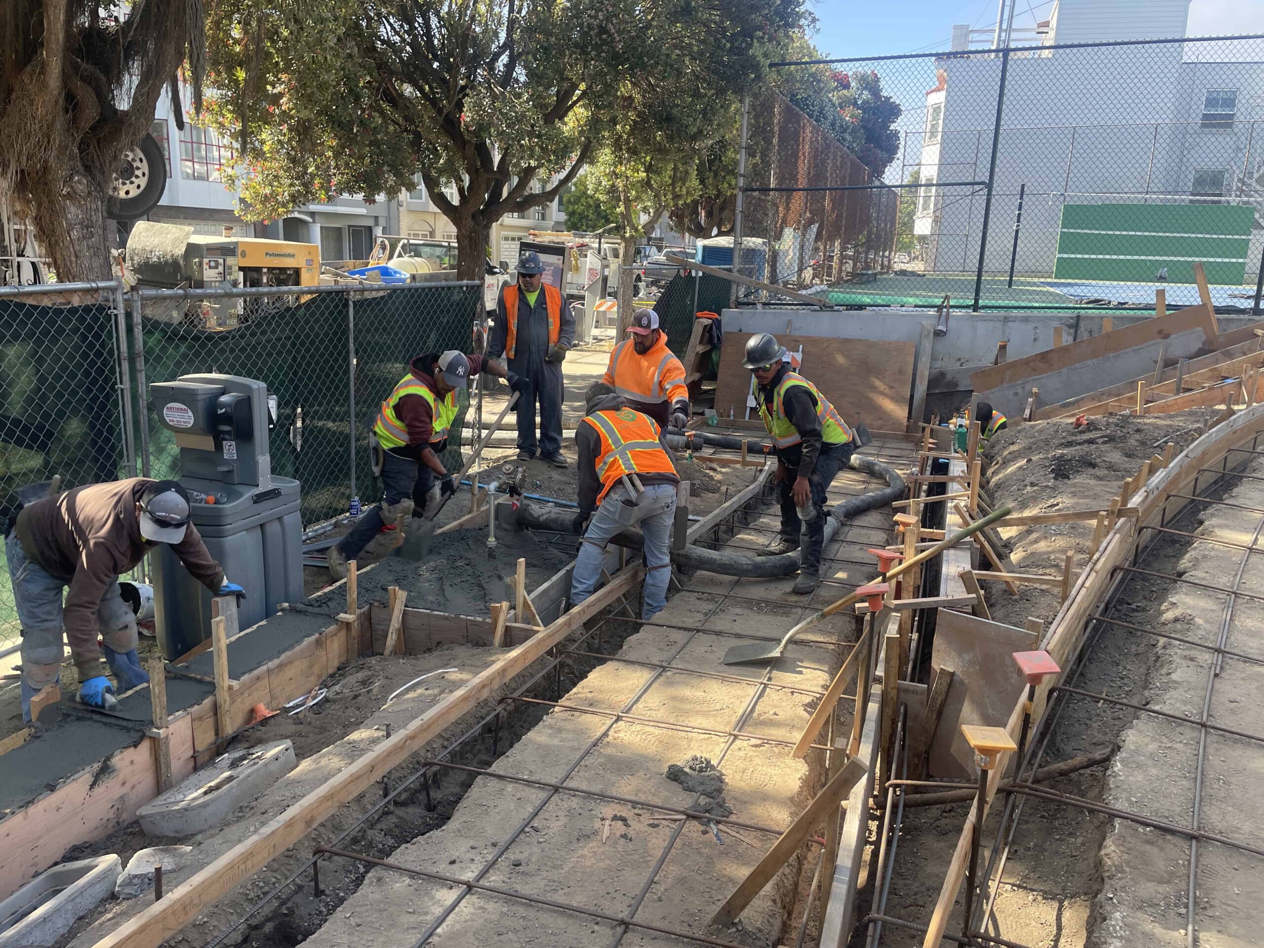 Concrete paving, synthetic turf concrete base, seatwall, stepped seatwall, ADA transfer seatwall, curb, flush curb, ADA ramp, stair and cheekwall, park sign footings, curb ramp, curb/gutter, asphalt patch paving, concrete base for stone pavers